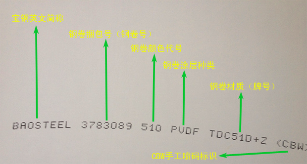宝钢彩钢板卷喷码是什么样子的,解释如下: